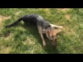 When Whitney came into rescue, less than a month ago, she was skin and bones, and appeared to be literally starving. She is starting to realize that she will never have to go hungry again. She loves her snacks and meals (she currently gets nutritious meals 3 times a day). She will let her humans touch her bowl while she eats, but she is clearly nervous and will growl if the household dog comes too close while she eats. This is pretty common with dogs that have gone hungry in the past, and usually resolves in time, as they realize that there's plenty to go around, and that they don't have to fight for resources. It's also easily managed by feeding separately or by feeding Whitney in her crate. Whitney is also a typical young GSD pup who needs to be monitored outside of her crate so that she only chews on her toys and other approved items.