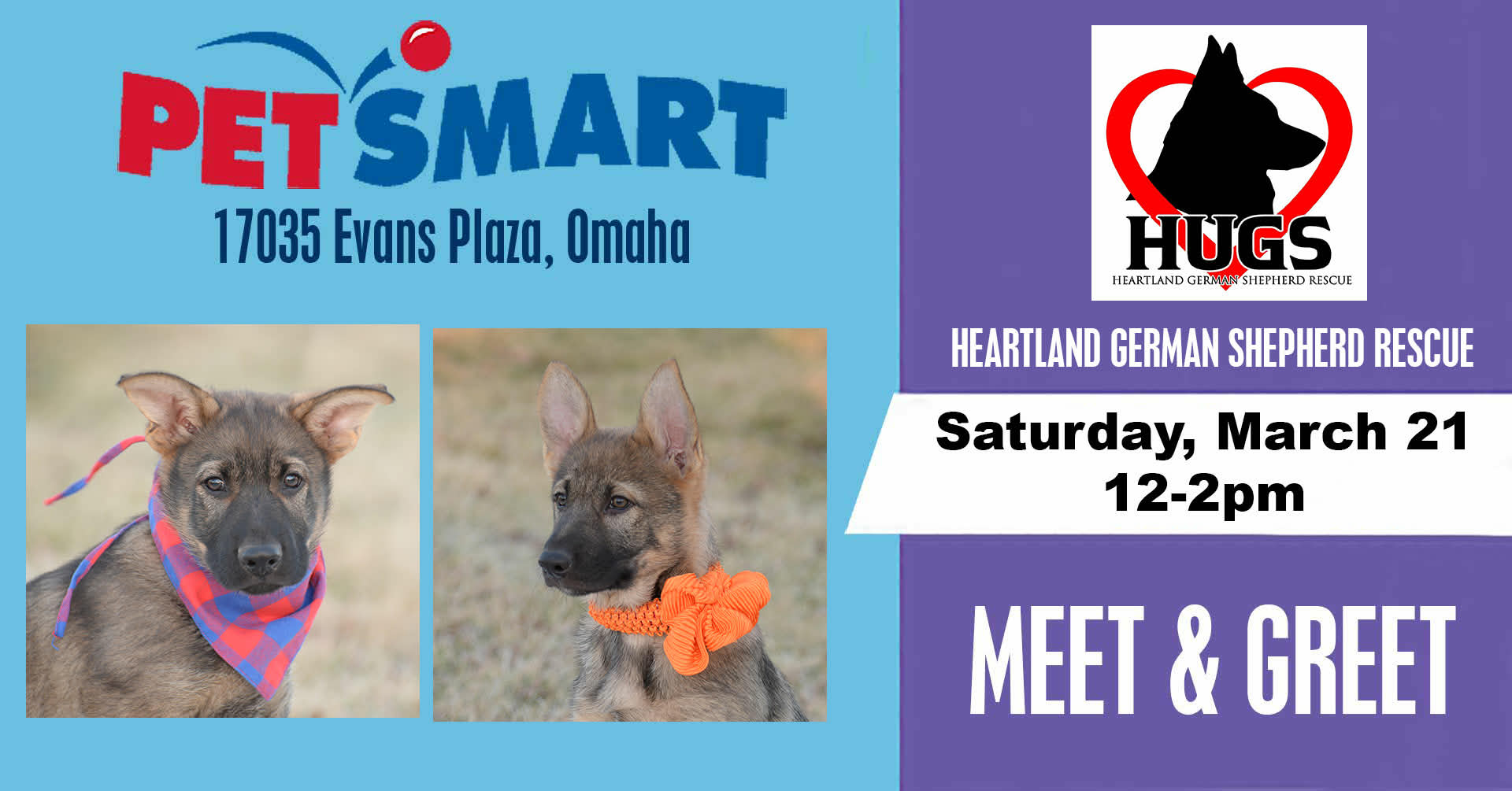 ** EVENT HAS BEEN CANCELLED*Come see us from 12pmĀ to 2:00pm at the PetSmart store located at 17035 Evans Plaza in Omaha. Meet adoptable dogs and chat with the HUGS volunteers to learn more about the pups, rescue, fostering, and how to get involved.